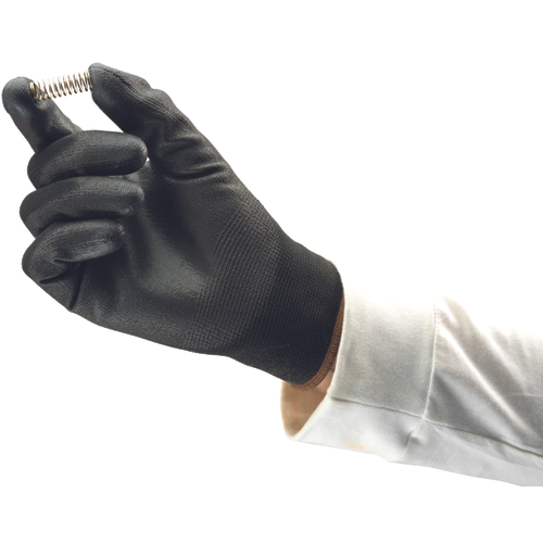 Bezešvé rukavice z nylonového úpletu, s vrstvou polyuretanu v dlani a na prstech, pružným nápletem a odolností vůči oděru tř. 4, vhodné pro lehké aplikace.