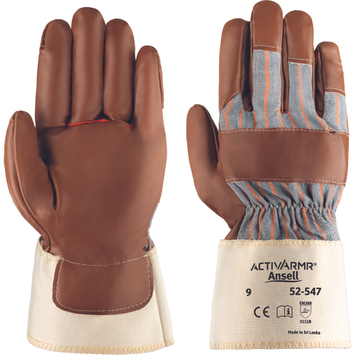 Antistatické rukavice šité z bavlněného úpletu, pruhované bavlny na hřbetu, s vrstvou hnědého nitrilu v dlani a na prstech, podšívkou a tuhou bezpečnostní manžetou.
