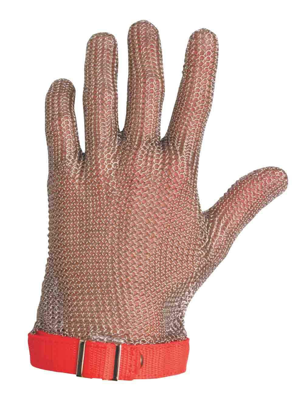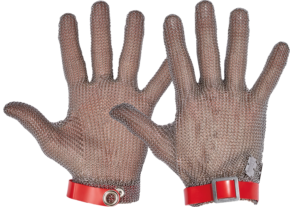 Rukavice z nerezových kroužků, s textilním stahovacím řemínkem a maximální ochranou proti pořezání, vhodné pro řezníky. 0114 0001 99 070 bílá, 0114 0001 99 080 červená, 0114 0001 99 090 modrá, 0114 0001 99 100 oranžová, 0114 0001 99 110 fialová