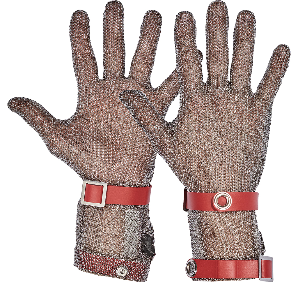 Rukavice z nerezových kroužků, s textilním stahovacím řemínkem, chráničem předloktí, maximální ochranou proti pořezání a 7,5 cm širokou manžetou. 0114 0002 99 080 červená, 0114 0002 99 090 modrá, 0114 0002 99 100 oranžová, 0114 0002 99 110 fialová
