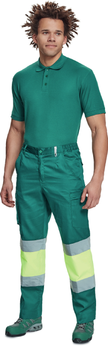 pánské pracovní kalhoty v kombinaci s Hi-Vis holenní částí s reflexními 7 cm pruhy, elastický pas, 2 postranní kapsy + 1 kapsička na drobné, 2 stehenní kapsy, 2 zadní kapsy, nastavitelná délka nohavic