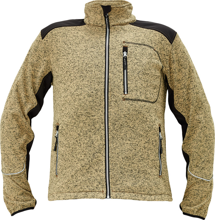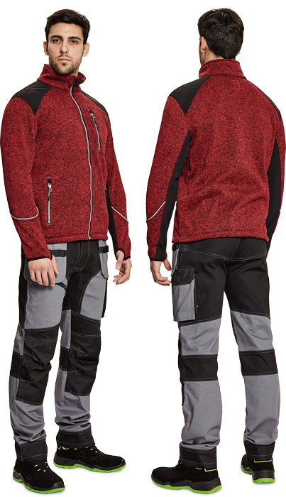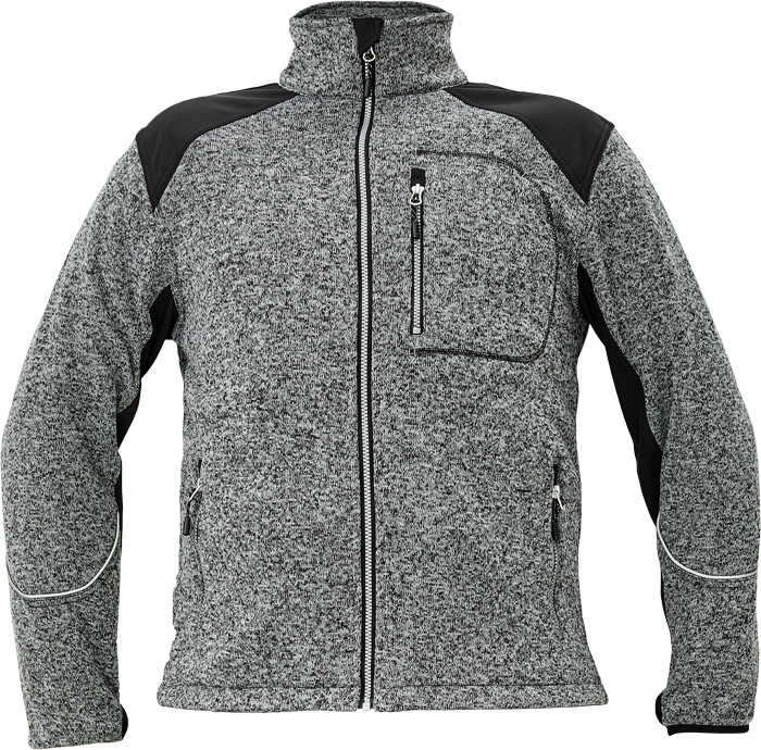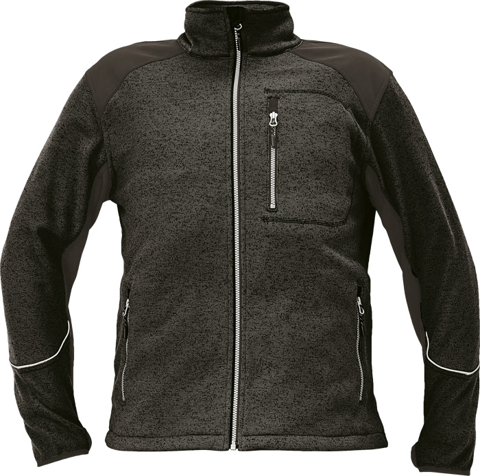 pánský celopropínací svetr z melírovaného úpletu uvnitř počesaná; zesílená část v oblasti ramen a rukávů sofsthellovým materiálem v kontrastní barvě; 1 náprsní kapsa na zip; 2 postranní kapsy na zip; nastavitelná šíře spodního obvodu; dekorativní reflexní paspulka na rukávu, očko na palec
