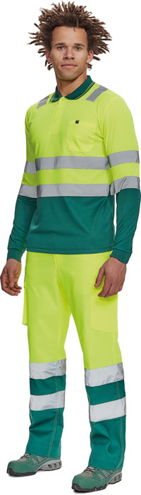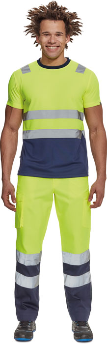 pánské Hi-Vis pracovní kalhoty s 7 cm reflexními pruhy, elastický pas, 2 postranní kapsy + 1 kapsička na drobné, 2 stehenní kapsy, 2 zadní kapsy, nastavitelná délka nohavic