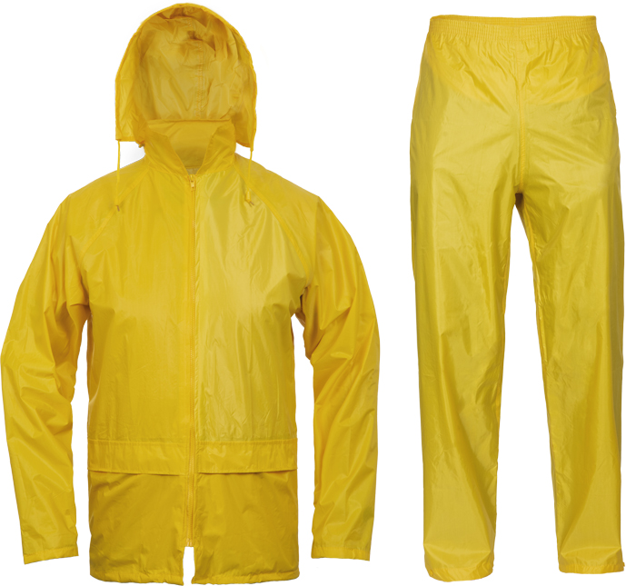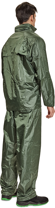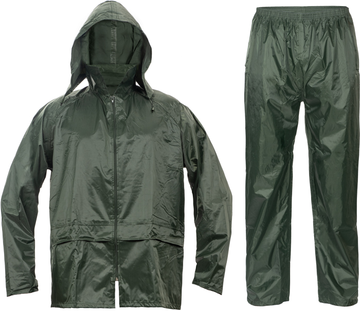 • dvoudílný voděodolný oblek s kapucí • ¾ plášť s integrovanou kapucí v límci a kalhoty v pase do gumy • dvě přední široké kapsy kryté légami proti průniku vody • spodní část rukávů lze regulovat drukem • ventilace na zádech a v podpaží • transportní obal