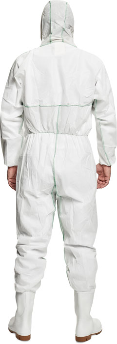 Ochranná kombinéza s kapucí a klopou na zipu a gumičkou stahovatelnými rukávy a nohavicemi, je odolná některým chemikáliím a průniku radioaktivních částic, patří do kategorie CE III, typu 5 a 6.