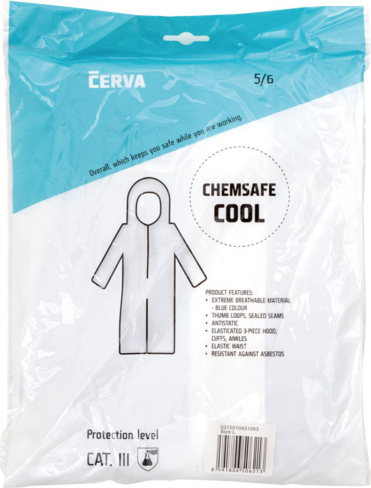 ochranná antistatická kombinéza s kapucí; přední materiál je vyroben s mikroporézní paropropustné vrstvy, zadní panely v modré barvě jsou z materiálu SMMS, který je neuveřitelně prodyšný; prodyšnost výrazně zlepšuje komfort pro uživatele při práci; na konci manžet jsou umístěny poutka na palce, aby rukávy vždy perfektně seděly na rukou, elastické okraje rukávů i nohavic