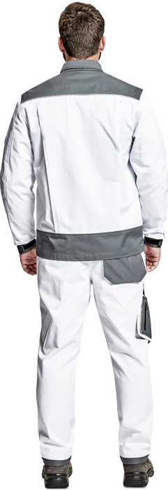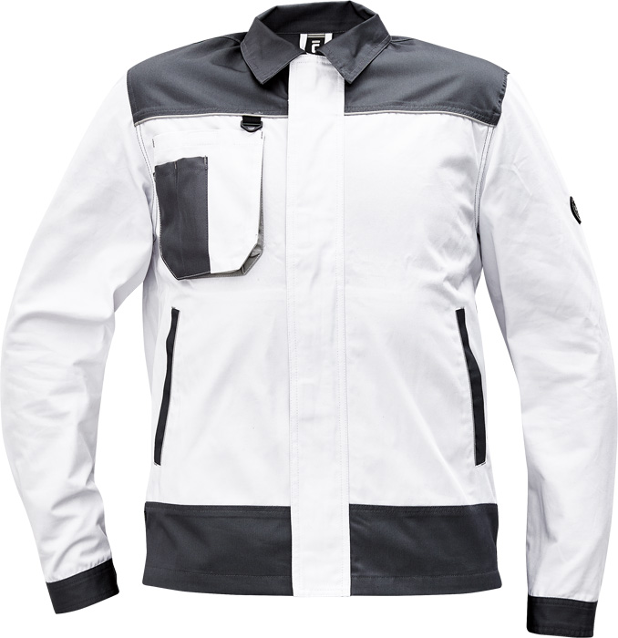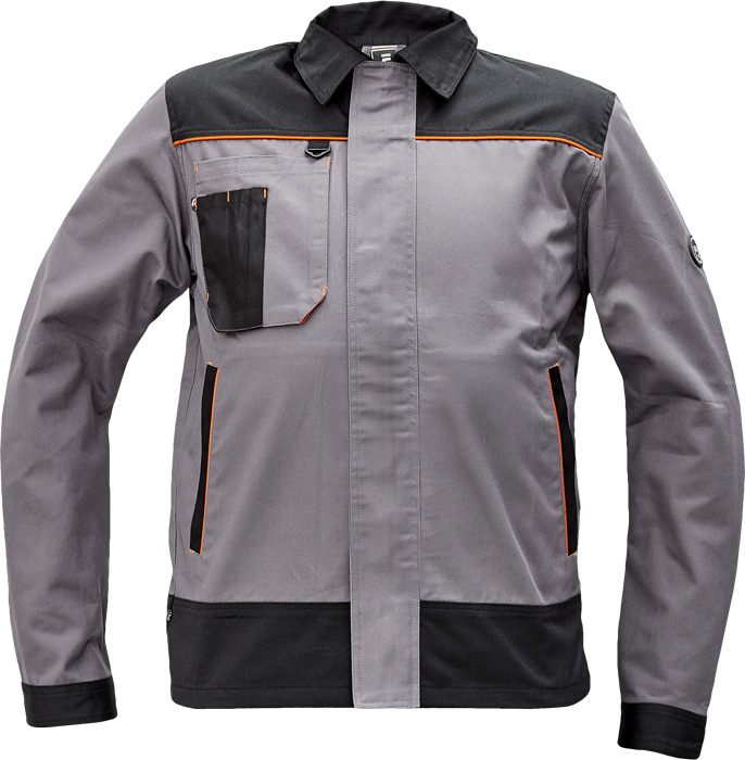 pánská pracovní bunda, materiál s vysokým procentem bavlněného podílu, moderní střih, zesílená oblast ramen materiálem Oxford, 2 boční lištové kapsy, 1 multifunkční náprsní kapsa, kontrastní paspulky, nastavitelná šíře rukávu na suchý zip, "D" kroužek