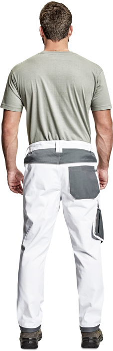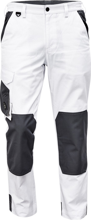 pánské pracovní kalhoty, materiál s vysokým procentem bavlněného podílu, moderní relax střih, elastický pas, zesílená oblast kolen materiálem Oxford s možností vkládání kolenních výztuh, 2 boční kapsy, 1 multifunkční kapsa na nohavici, 1 zadní kapsa se zapínáním na suchý zip, "D" kroužek, kontrastní paspulky, nastavitelná délka nohavic
