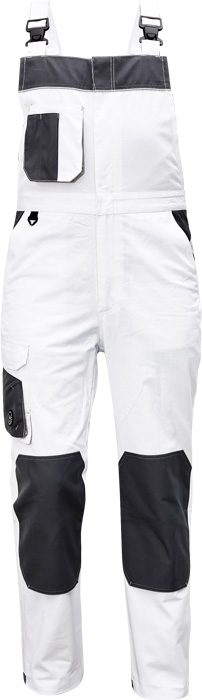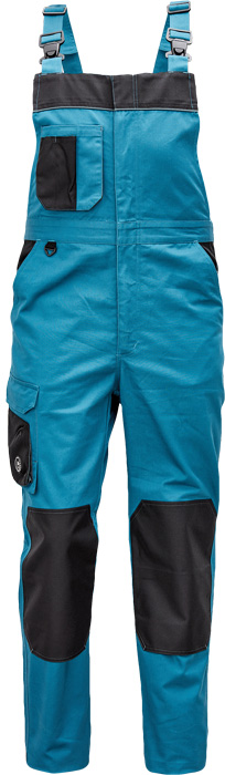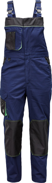 pánské pracovní kalhoty s laclem, materiál s vysokým procentem bavlněného podílu, moderní relax střih, elastický pas, zesílená oblast kolen materiálem Oxford s možností vkládání kolenních výztuh, 2 boční kapsy, 1 multifunkční kapsa na nohavici, 1 zadní kapsa se zapínáním na suchý zip, 1 náprsní multifunkční kapsa, "D" kroužek, dvoucestný zip, kontrastní paspulky, nastavitelná délka nohavic