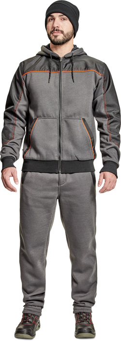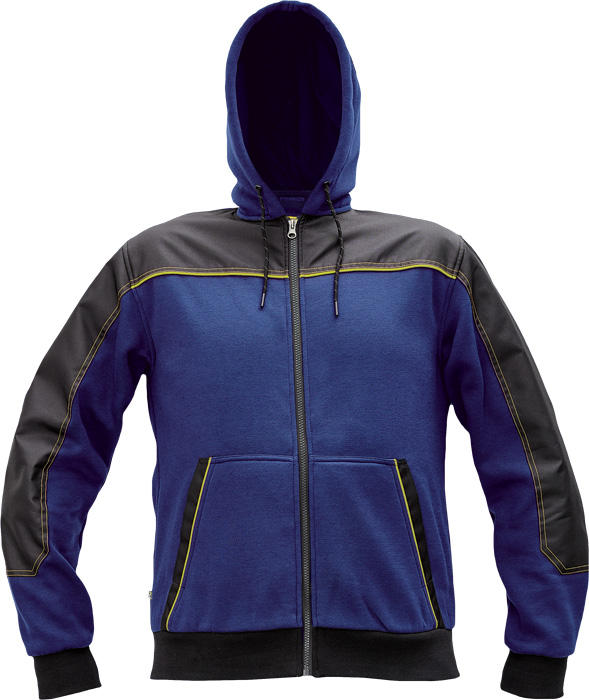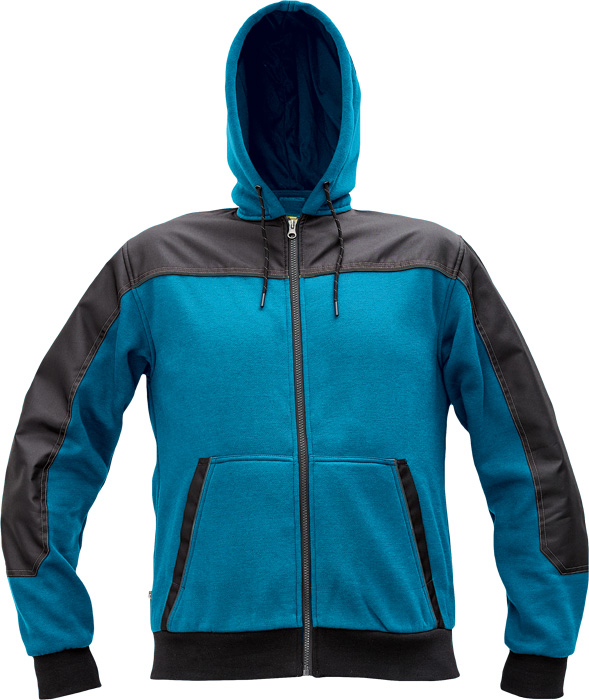 pánská celopropínací mikina na zip s kapucí, kvalitní počesaný výplněk, zesílená oblast ramen a loktů z materiálu Oxford, 2 přední klokaní kapsy, kontrastní paspulky, elastické žebrované náplety na rukávech a spodním obvodu, poutka na přichycení do Cremorne zimní bundy
