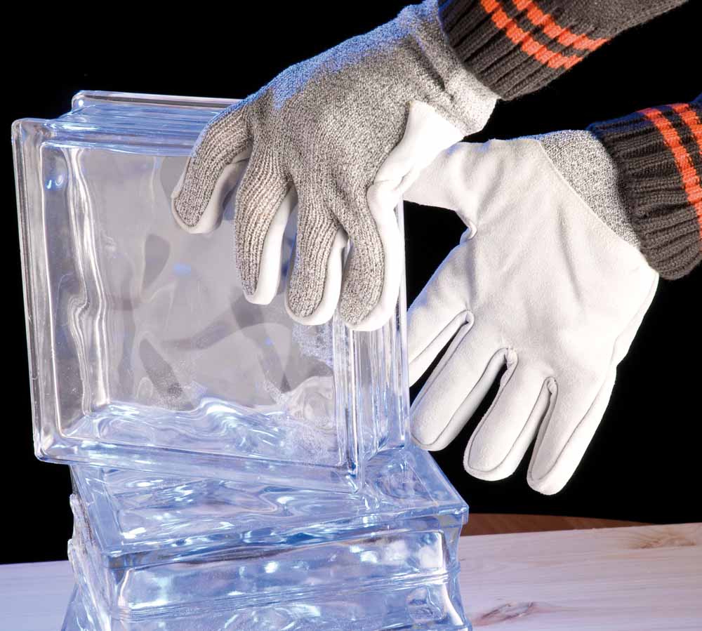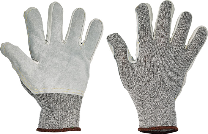 Pletené bezešvé rukavice z modifikovaného skleněného vlákna, Spandexu a nylonu, se zesílením z hovězí štípenky v dlani a na prstech a odolností proti prořezu kategorie E.