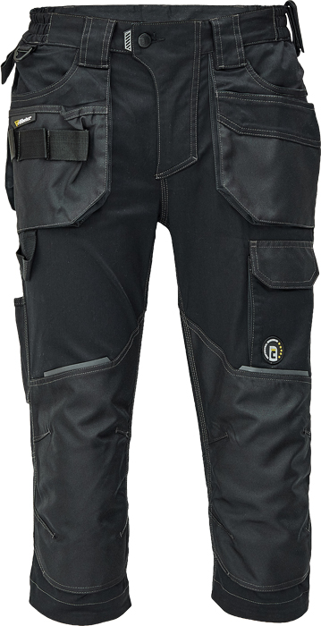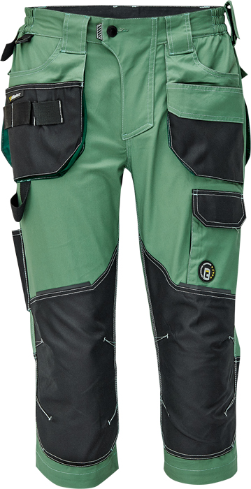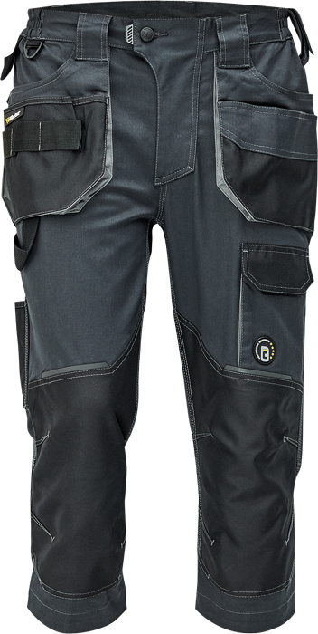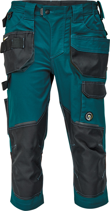 pánské pracovní 3/4 kalhoty, elastický inovativní materiál TRIFIBETEX®, ergonomický střih, snížený pružný pas, odolné trojité prošití nohavic a sedu, zesílená oblast kolen s možností vkládání kolenních výztuh, prostorné multifunkční přední kapsy s poutky na nářadí, 2 zadní kapsy s klopou zesílené Oxfordem, stehenní kapsa na telefon s klopou a zapínáním na suchý zip, kapsa na metr a nůž, poutko na kladivo, "D" kroužek, poutko na nářadí v pase, originální zpracování zapínání kalhot, reflektivní prvky v barevném odstínu