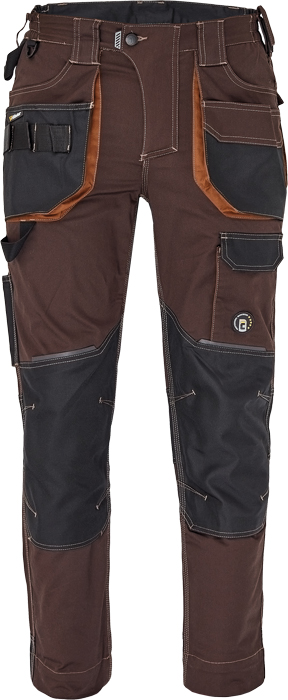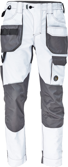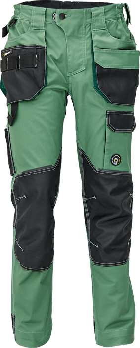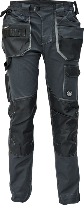 pánské pracovní kalhoty, elastický inovativní materiál TRIFIBETEX®, ergonomický střih, snížený pružný pas, odolné trojité prošití nohavic a sedu, zesílená oblast kolen s možností vkládání kolenních výztuh, prostorné multifunkční přední kapsy s poutky na nářadí, 2 zadní kapsy s klopou zesílené Oxfordem, stehenní kapsa na telefon s klopou a zapínáním na suchý zip, kapsa na metr a nůž, poutko na kladivo, "D" kroužek, poutko na nářadí v pase, originální zpracování zapínání kalhot, reflektivní prvky v barevném odstínu, nastavitelná délka nohavic