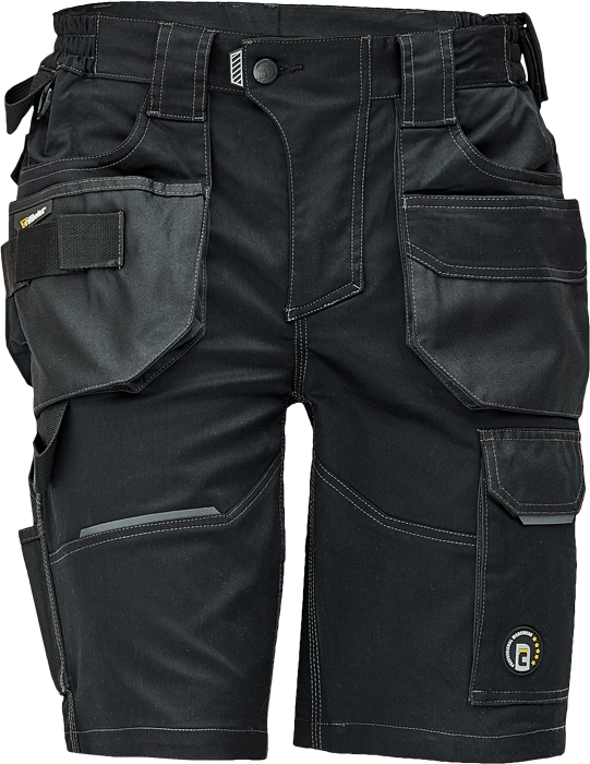 pánské pracovní šortky, elastický inovativní materiál TRIFIBETEX®, ergonomický střih, snížený pružný pas, odolné trojité prošití nohavic a sedu, prostorné multifunkční přední kapsy s poutky na nářadí, 2 zadní kapsy s klopou zesílené Oxfordem, stehenní kapsa na telefon s klopou a zapínáním na suchý zip, kapsa na metr a nůž, poutko na kladivo, "D" kroužek, poutko na nářadí v pase, originální zpracování zapínání kalhot, reflektivní prvky v barevném odstínu