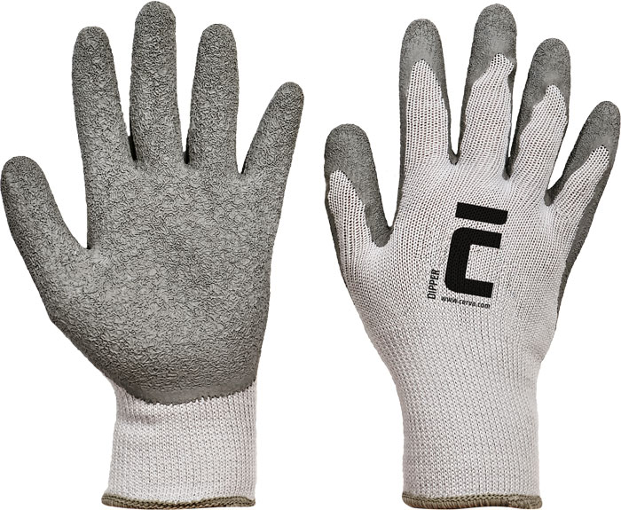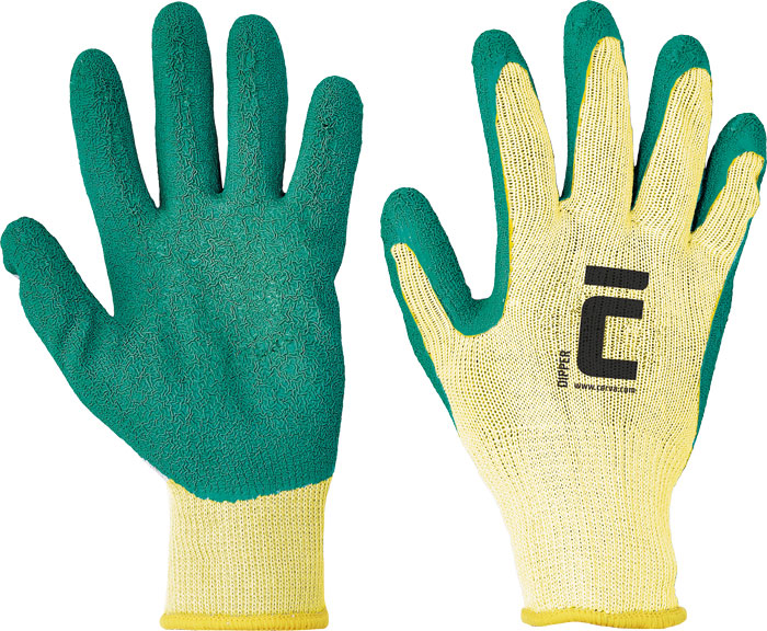 Pletené bezešvé nylonové rukavice, polomáčené v latexu, protiskluzová úprava v dlani a na prstech, pružný náplet na zápěstí. Velikosti: dámské 7, 8 (zelená), pánské 9, 10, 11 (šedá)