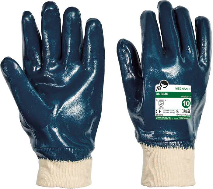 Rukavice šité z bavlněného úpletu, máčené v silnější vrstvě nitrilu (protismykový úchop) a elastická pletená manžeta zabraňující průniku nečistot. Jsou určené pro prácí s abrazivními materiály v silně zaolejovaném prostředí.