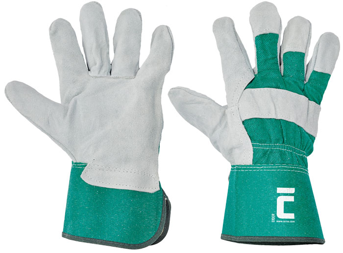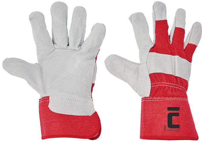 Rukavice z jednoho kusu silné hovězí štípenky v dlani s podšívkou, bavlněné tkaniny na hřbetu, s bavlněnou vyztuženou manžetou, celokoženými palci a ukazováčky a překrytými špičkami prstů.