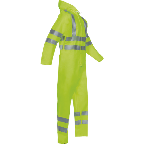 HI-VIS kombinéza s pevnou kapucí; zapínání na zip překryté klopou na druky; elastická záda a pas; manžety v rukávech; zatavené švy; spodní lemy nohavic se zapínáním na druky.