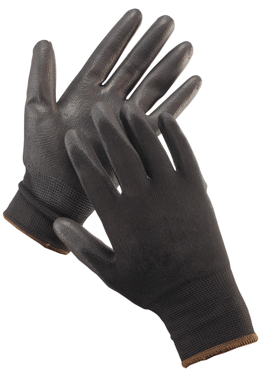 Pletené bezešvé polyesterové rukavice máčené v PU v dlani a na prstech, elastická manžeta.