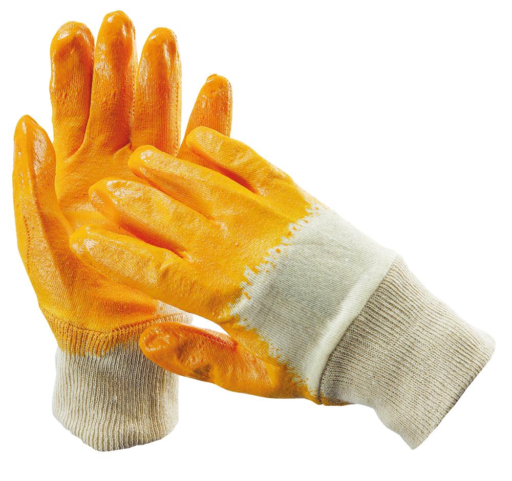 Šité rukavice z bavlny, máčené v nitrilu, s pružným nápletem na zápěstí.