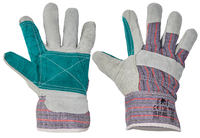 Kombinované rukavice z hovězí štípenky a textilu. Zesílená dlaň s podšívkou, tkanina na hřbetu.