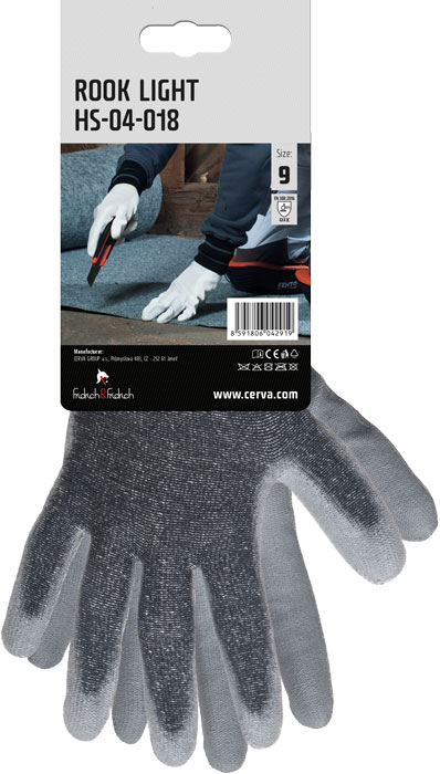 Pletené bezešvé rukavice kategorie prořezu C, šedý PU na dlani a prstech, pružná manžeta.