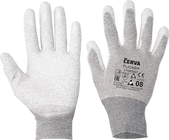 Pletené bezešvé antistatické nylonové rukavice s integrovaným uhlíkovým vláknem, vrstvou polyuretanu v dlani a na prstech a pružnou manžetou.