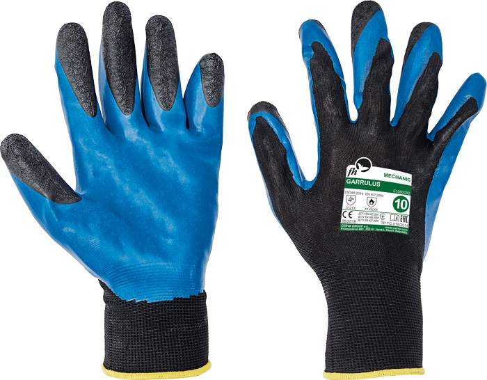 Pletené bezešvé rukavice z polyesteru, polomáčené v latexu (zdrsněná vrstva na prstech, hladká v dlani), elastická manžeta. Delší životnost, zdvojené máčení koneců prstů.