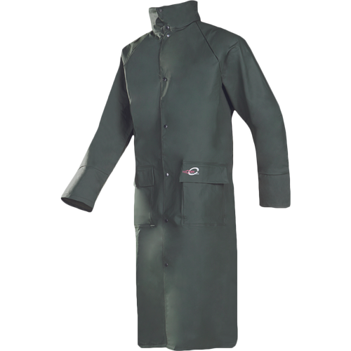 • nepromokavý a větruodolný prodloužený plášť s kapucí v límci • délka 120 cm • zatavené švy • zapínání na druky • 2 přední kapsy kryté légami