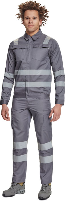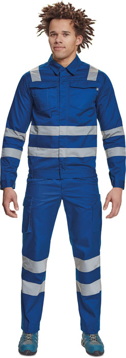 pánská pracovní bunda s retroreflexními pruhy přes ramena, v bocích a na rukávech, zapínání na zip kryté légou na suchý zip, 2 náprsní kapsy s klopou, elastický lem v bocích, nastavitelná šířka rukávů pomocí suchého zipu