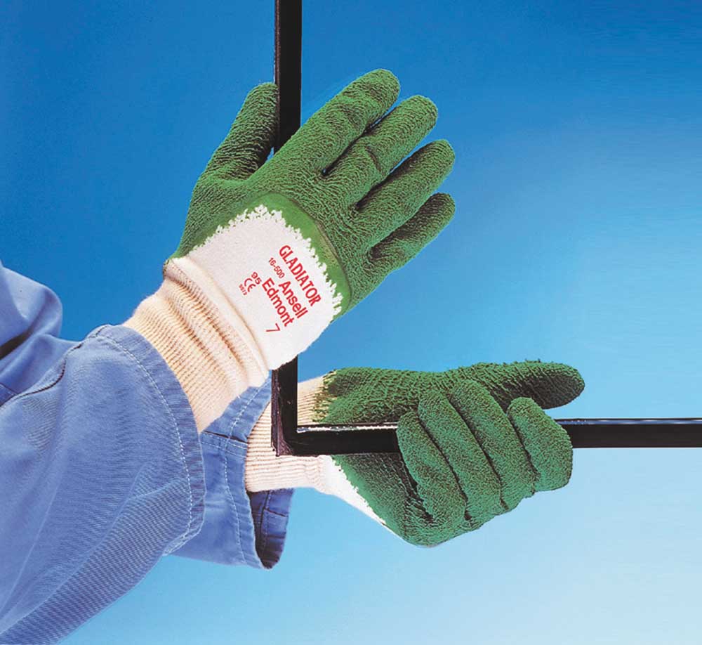 Rukavice šité z bavlněného úpletu, dlaň a prsty máčené v kaučuku, s protiskluzovou úpravou a nápletem na zápěstí.