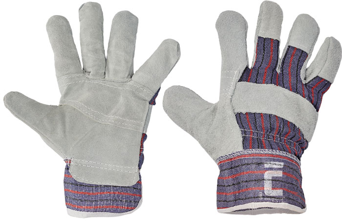 Rukavice z hovězí štípenky v dlani s podšívkou, hřbet a manžeta z bavlněné tkaniny.