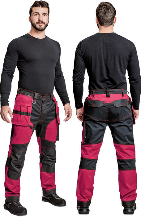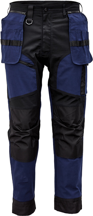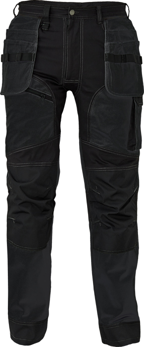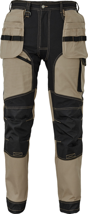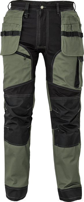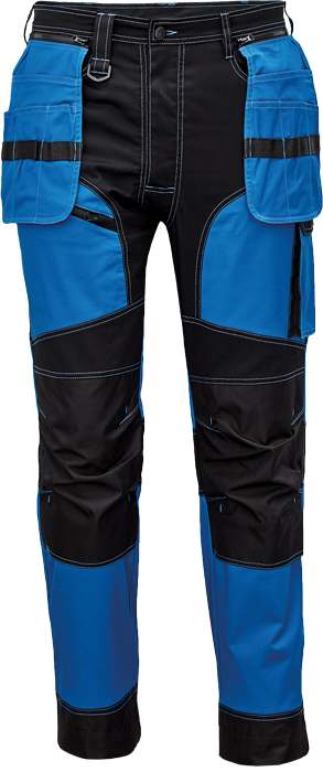 pánské pracovní kalhoty z elastického materiálu; 2 postranní kapsy a 2 vložitelné multifunkční kapsy na nářadí; "D" kroužek; 1 boční kapsa na nohavici s patkou; 1 kapsa na nohavici na zip; 2 nakládané zadní kapsy s patkou; zesílená oblast kolen s možností; vkládání kolenních výztuh; záložka na nohavici umožňující prodloužení délky až o 5 cm; zesílená zadní strana spodku nohavice; dekorativní prošití; 265 g/m2