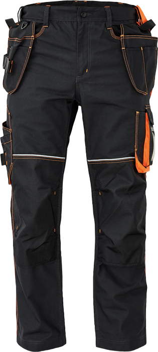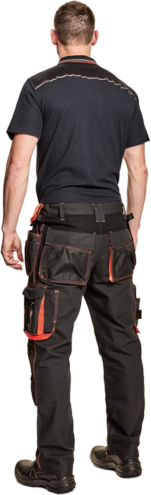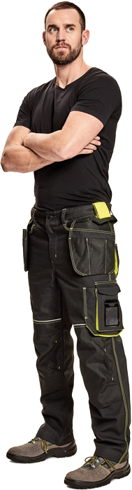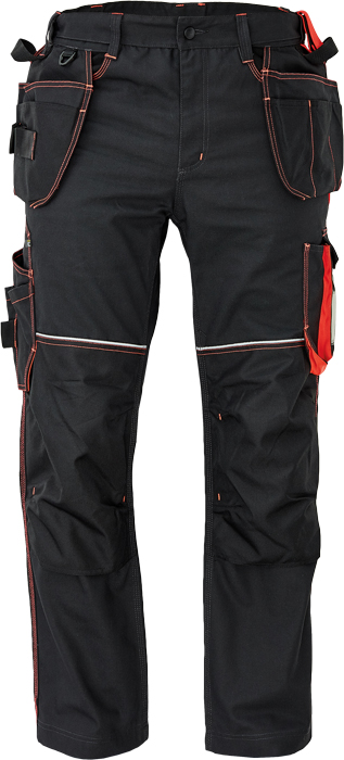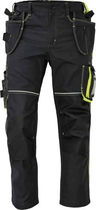 pánské pracovní klahoty s elastickým pasem; 2 postranní kapsy a 2 vložitelné multifunkční kapsy na nářadí; 2 boční kapsy na nohavicích + 1 transparentní pro ID kartu, D kroužek; 2 nakládané zadní kapsy s patkou; poutko na nářadí v kontrastní barvě; 2 postranní poutka na nářadí; zesílená oblast kolen s možností vkládání kolenních výztuh; záložka na nohavici umožňující prodloužení délky až o 5 cm; zesílená zadní strana spodku nohavice; dekorativní prošití a kontrastní prvky v hi-vis barvě