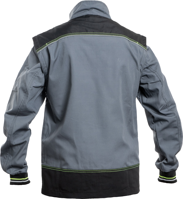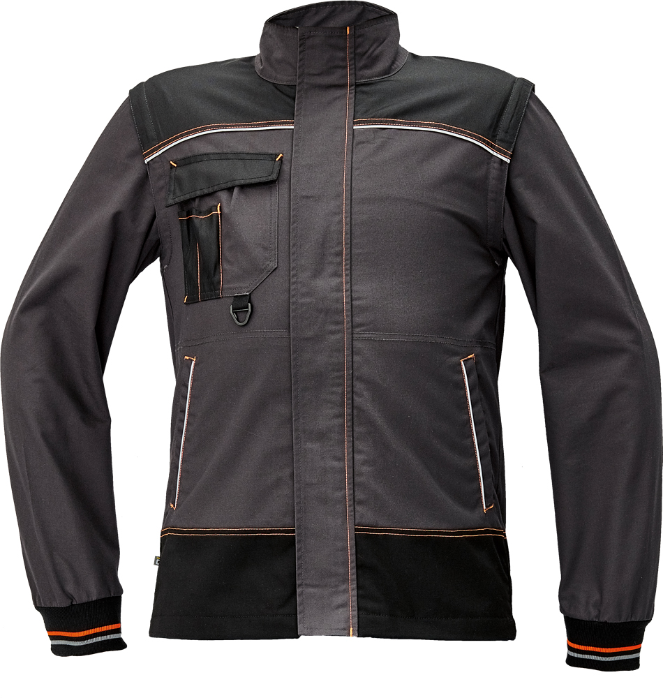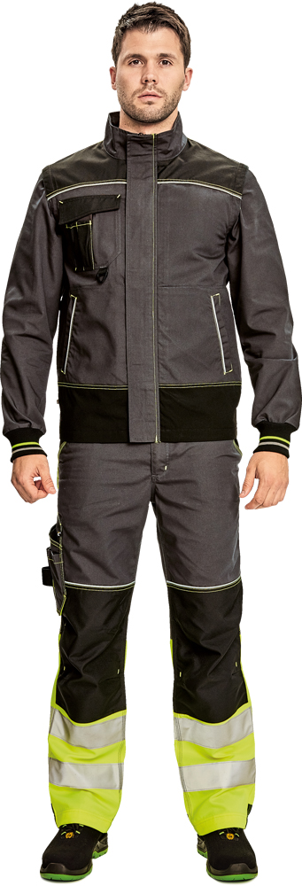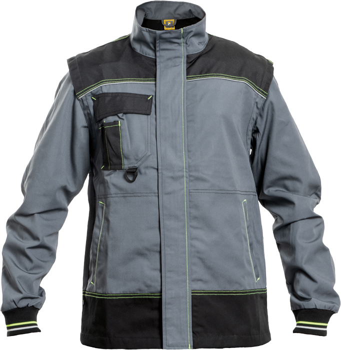 • pánská pracovní bunda moderního střihu se stojáčkem • hluboké postranní kapsy • multifunkční náprsní kapsa • D kroužek pro přichycení identifikační karty • zesílená oblast ramen • náplety na rukávech • prošití kontrastní nití v hi-vis barevném odstínu