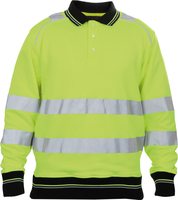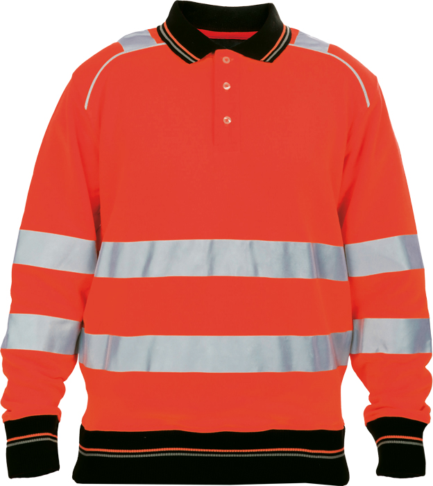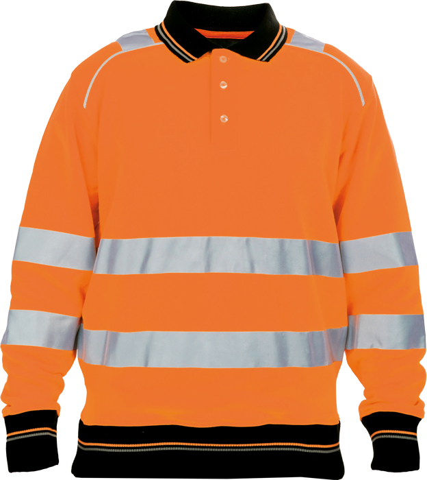 pánská HI-VIS mikina s límečkem z počesaného výplňku směsi polyesteru a bavlny; propínací léga na 3 knoflíky; kontrastní proužky v nápletech rukávů a spodním lemu; dvojice reflexních pruhů po obvodu pasu a rukávů a přes ramena; dekorativní prošití v HI-VIS barvě.