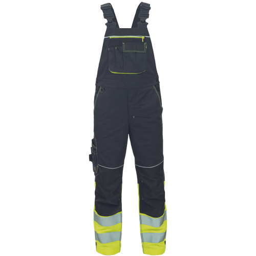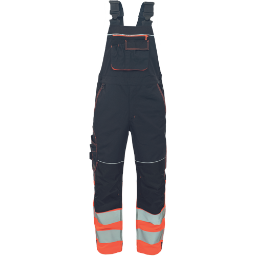 pánské pracovní kalhoty s laclem v kombinaci s HI-VIS spodní částí nohavic; dvojice tištěných 7,5 cm reflexních pruhů; elastický pas; 6 funkčních kapes; 600D Oxford zesílení v oblasti kolen s možností vkládání kolenních výztuh; dekorativní prošití v kontrastní HI-VIS barvě; nastavitelné délka nohavic.