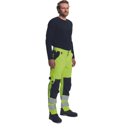 pánské HI-VIS pracovní kalhoty s elastickým pasem; dvojice tištěných 7,5 cm reflexních pruhů; 5 funkčních kapes; 600D Oxford zesílení v oblasti kolen s možností vkládání kolenních výztuh; dekorativní prošití v kontrastní HI-VIS barvě; nastavitelné délka nohavic.