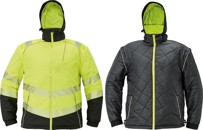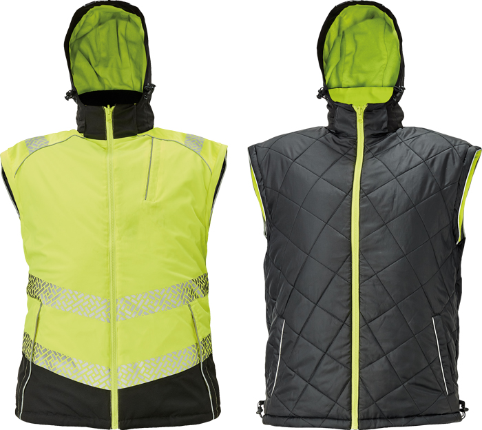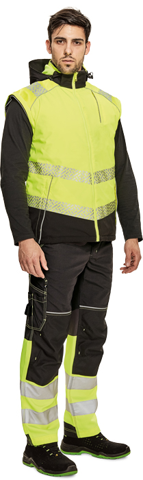 pánská oboustranná zateplená bunda 4 v 1 s odepínacími rukávy a kapucí; hi-vis verze se segmentovanými reflexními pruhy a reflexními paspulkami; 2 postranní kapsy na zip; 1 náprsní kapsa na zip; nastavitelná šíře spodního obvodu pomocí stahovací šňůrky; zip krytý légou; obrácená verze v černé barvě s kontrastními reflexními paspulkami