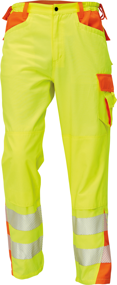 • pánské kalhoty v atraktivním provedení kombinace 2 hi-vis barev s reflexními natištěnými pruhy • 2 hluboké přední kaspy • 2 multifukční kapsy po stranách nohavice • 2 zadní kapsy s patkou • elastický pas a poutko na nářadí