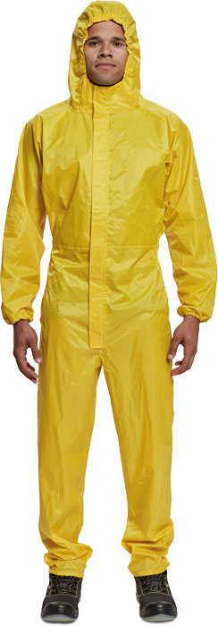 voděodolný overal s kapucí; přední zapínání na zip kryté klopou na suchý zip; overal má přelepené švy; elastický pas, lemy rukávů, nohavic a kapuce na gumičku.