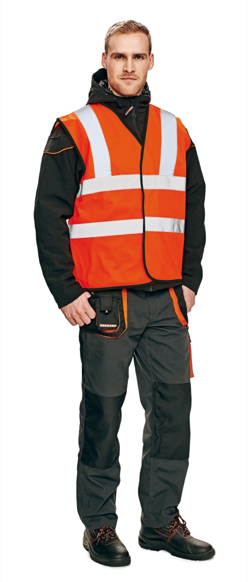 • Hi -Vis vesta s kontrastními černými paspulemi a reflexními pruhy • reflexní pásky 3x šířka 5 cm • zapínání na suchý zip