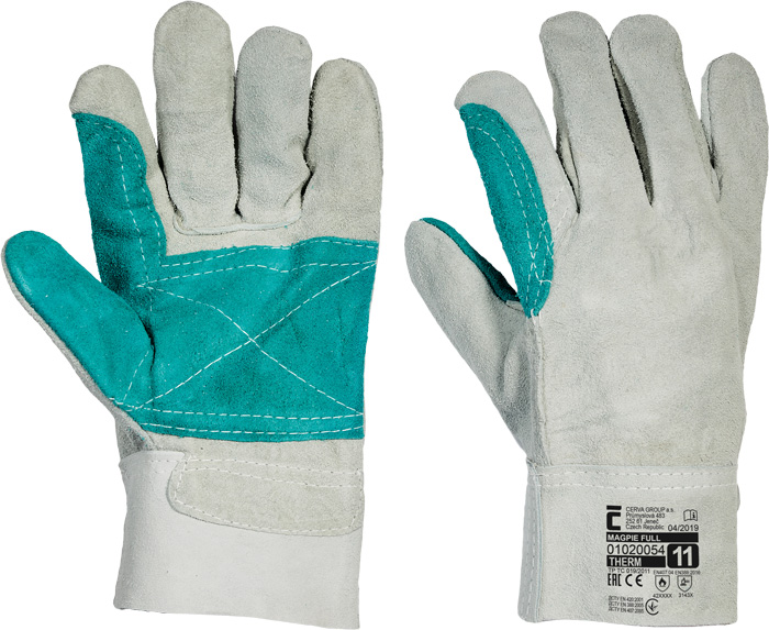 Rukavice z hovězí štípenky, zesílená dvojitá vrstva v dlani na palci a ukazovák a s 7 cm manžetou.