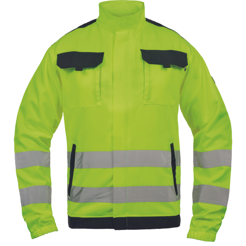 • unisex HI-VIS pracovní bunda se zapínáním na zip krytým légou • 2 boční kapsy • 2 náprsní kapsy s klopou na suchý zip • 2 šité 5 cm široké reflexní pruhy přes boky a spodní rukávy • zesílení namáhaných částí ramen • pružné manžety rukávů a spodní obvod v pase