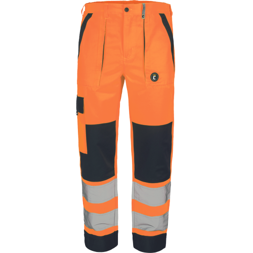 • pánské HI-VIS pracovní kalhoty s elastickým pasem • 2 přední kapsy • 1 stehenní kapsa • 2 zadní kapsy se zapínáním na suchý zip • 2 šité 7,5 cm široké reflexní pruhy na spodních částech nohavic • zesílená oblast kolen • nastavitelná délka nohavic