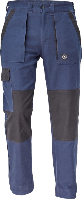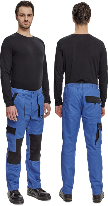 pánské pracovní kalhoty s elastickým pasem; 2 přední kapsy, 1 stehenní kapsa, 2 zadní kapsy; zesílená oblast kolen; nastavitelná délka nohavic.