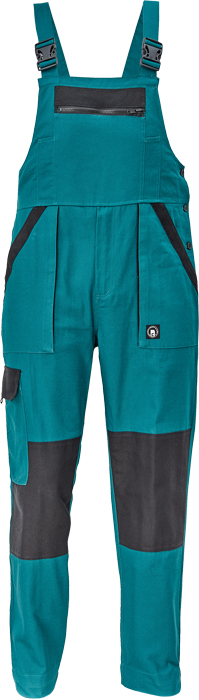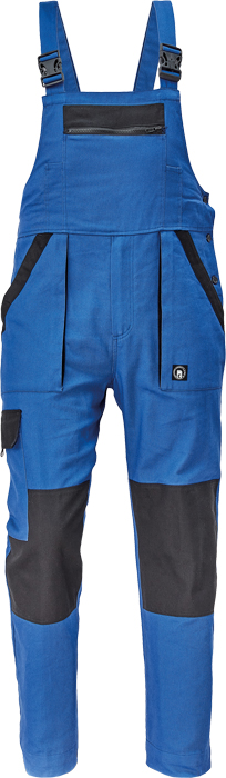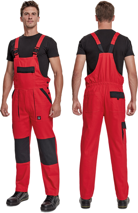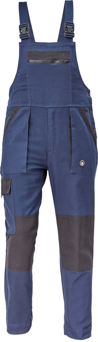 pánské pracovní kalhoty s laclem a elastickým pasem; široké šle s plastovými sponami; 2 přední kapsy, 1 stehenní kapsa; 1 velká náprsní kapsa, 2 zadní kapsy; zesílená oblast kolen; nastavitelná délka nohavic.