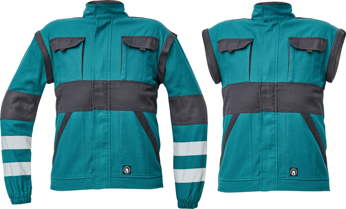 pánská pracovní bunda se zapínáním na zip krytým légou; odepínatelné rukávy; 2 přední kapsy, 2 náprsní kapsy; zesílení namáhaných míst loktů a ramen; reflexní pruhy po odvodu rukávů a ve spodní části zad; pružné manžety rukávů a spodní obvod v pase.