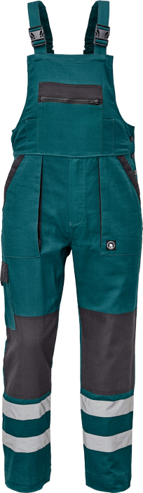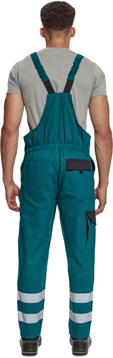 pánské pracovní kalhoty s laclem a elastickým pasem; široké šle s plastovými sponami; 2 přední kapsy, 1 stehenní kapsa; 1 velká náprsní kapsa, 2 zadní kapsy; reflexní pruhy na spodní části nohavic; zesílená oblast kolen.