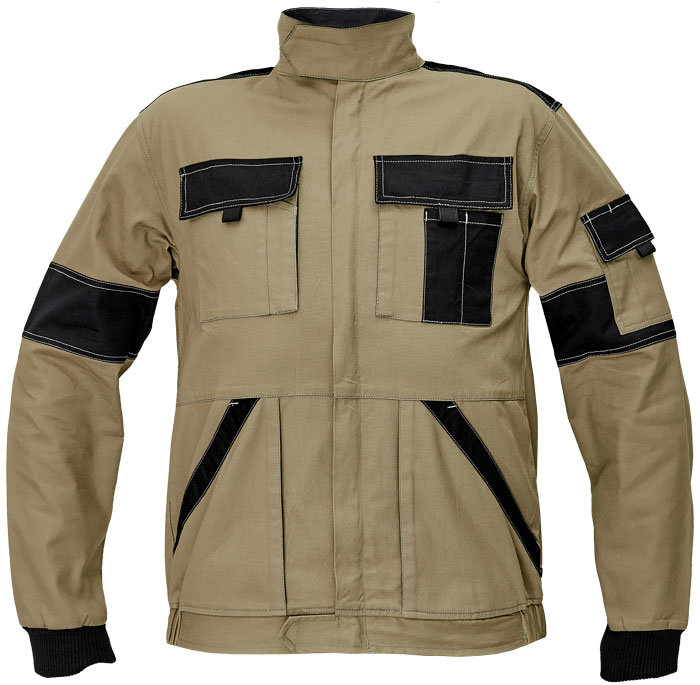 pánská lehká pracovní bunda se zapínáním na zip krytým légou; 2 přední kapsy, 2 náprsní kapsy s klopou; 1 malá kapsa na levém rukávu; zesílení namáhaných míst loktů a ramen; pružné manžety rukávů a spodní obvod v pase.